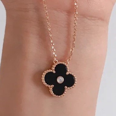 Black onyx single motif necklace-with zircon(黑玛瑙间钻四叶草单花项链)