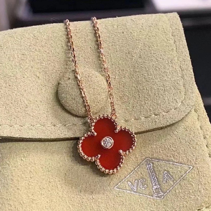 Home Van Cle* Necklace Carnelian single motif necklace-with zircon(红玉髓间钻四叶草单花项链)