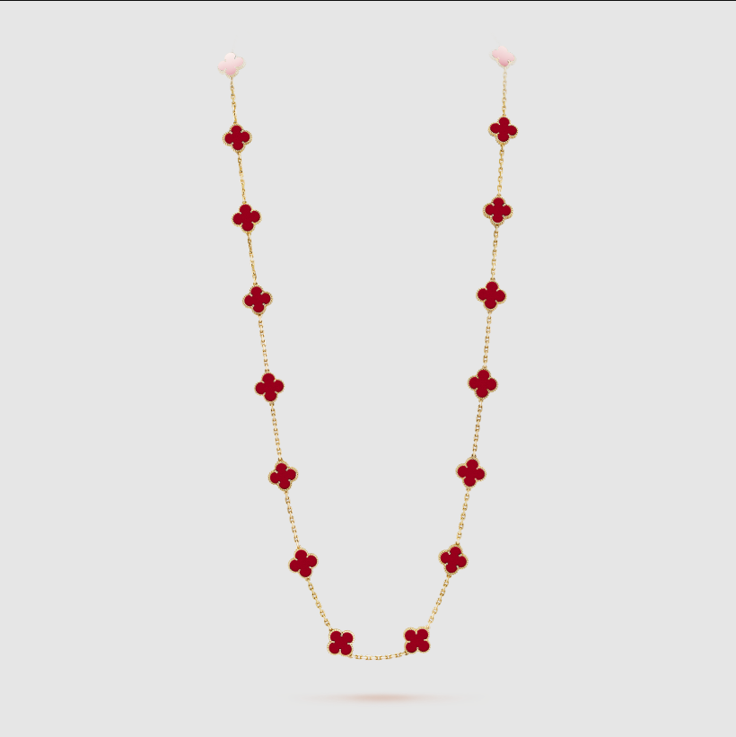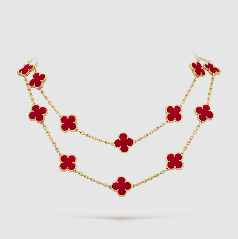 Home Van Cle* Necklace Yellow Gold red chalcedony 20 motifs necklace(金色红玉髓四叶草二十花项链)